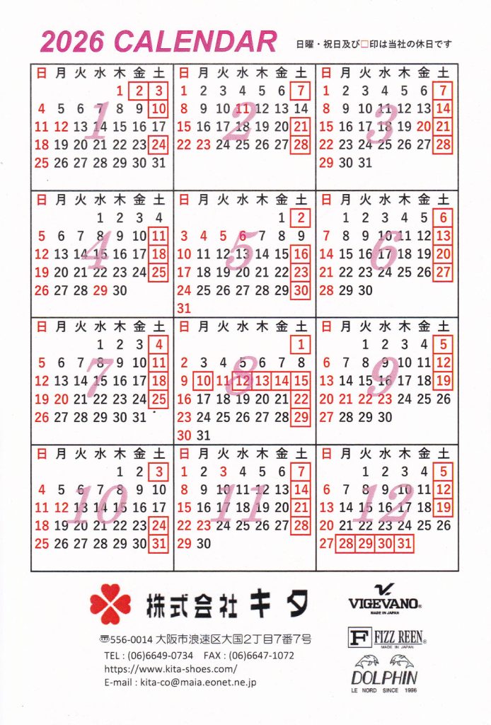 202511/28 2026年 年間カレンダー 営業カレンダー株式会社キタ 202412/25 2025年 年間カレンダー 営業カレンダー株式会社キタ 202311/30 2024年 年間カレンダー 営業カレンダー株式会社キタ 202211/29 2023年 年間カレンダー 営業カレンダー株式会社キタ 202112/03 2022年 年間カレンダー 営業カレンダー株式会社キタ 202011/24 2021年 年間カレンダー 営業カレンダー株式会社キタ 201912/04 2020年 年間カレンダー ※ 臨時休業 5月9日(土)、16日(土)、30日(土) 営業カレンダー株式会社キタ 201812/05 2019年 年間カレンダー 営業カレンダー株式会社キタ 201712/05 2018年営業カレンダー 営業カレンダー株式会社キタ 201612/09 2017年営業カレンダー 営業カレンダー株式会社キタ 1 2 ›
